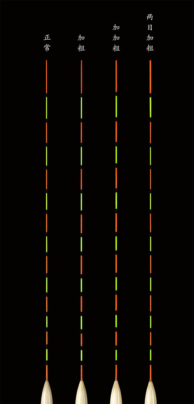 3.漂尾兩目加粗:將漂尾尾尖加粗兩目,讓尾尖兩目更粗、更醒目(少數(shù)漂型也可以做三目)。現(xiàn)有的加粗尺寸為0.8mm-1.4mm幾種規(guī)格,但加粗的具體尺寸在制做時,需要根據(jù)漂尾先徑來選擇。
